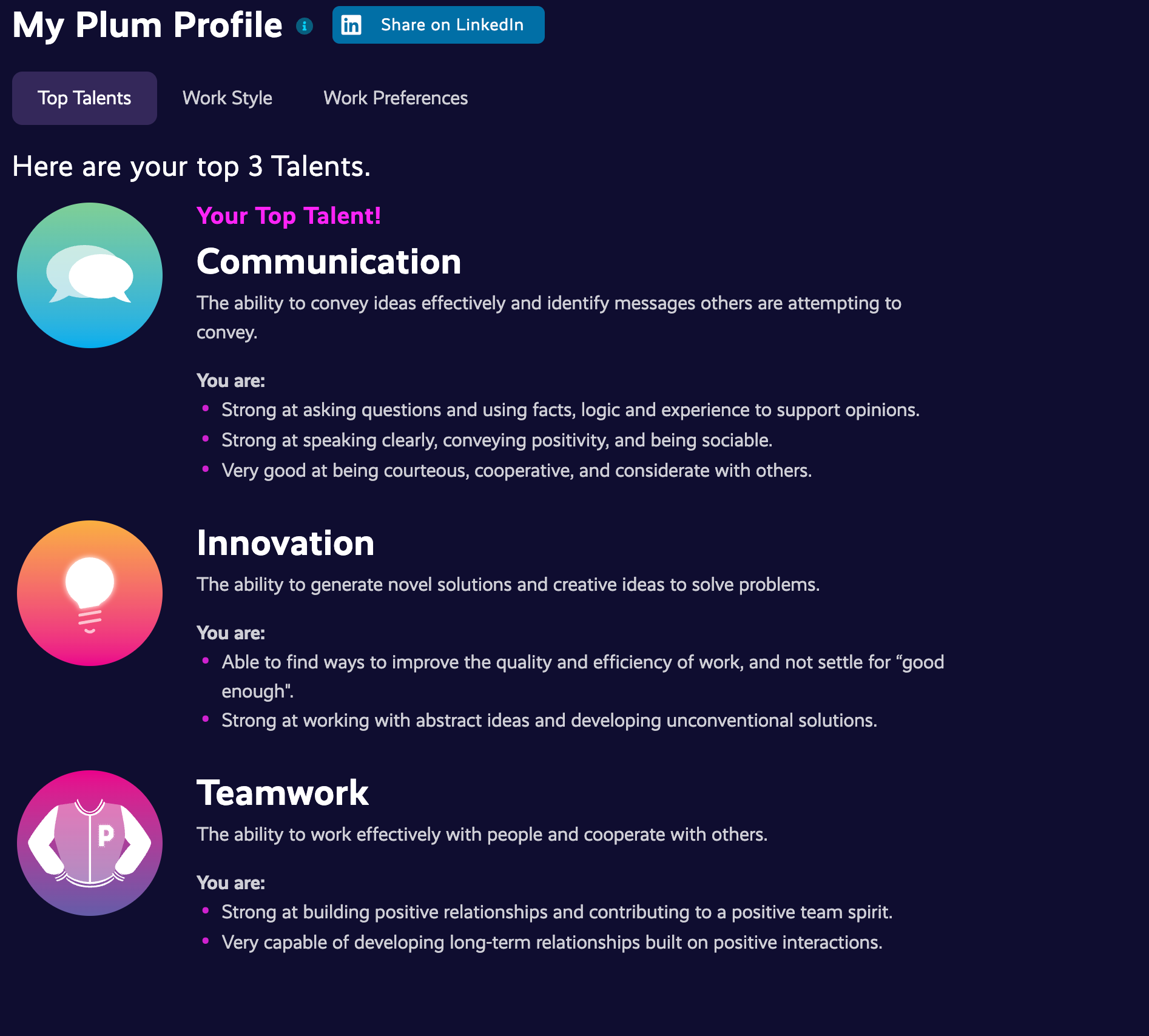 - Upon completion, candidates receive a Plum profile highlighting top talents like communication, decision-making, teamwork etc. based on performance.