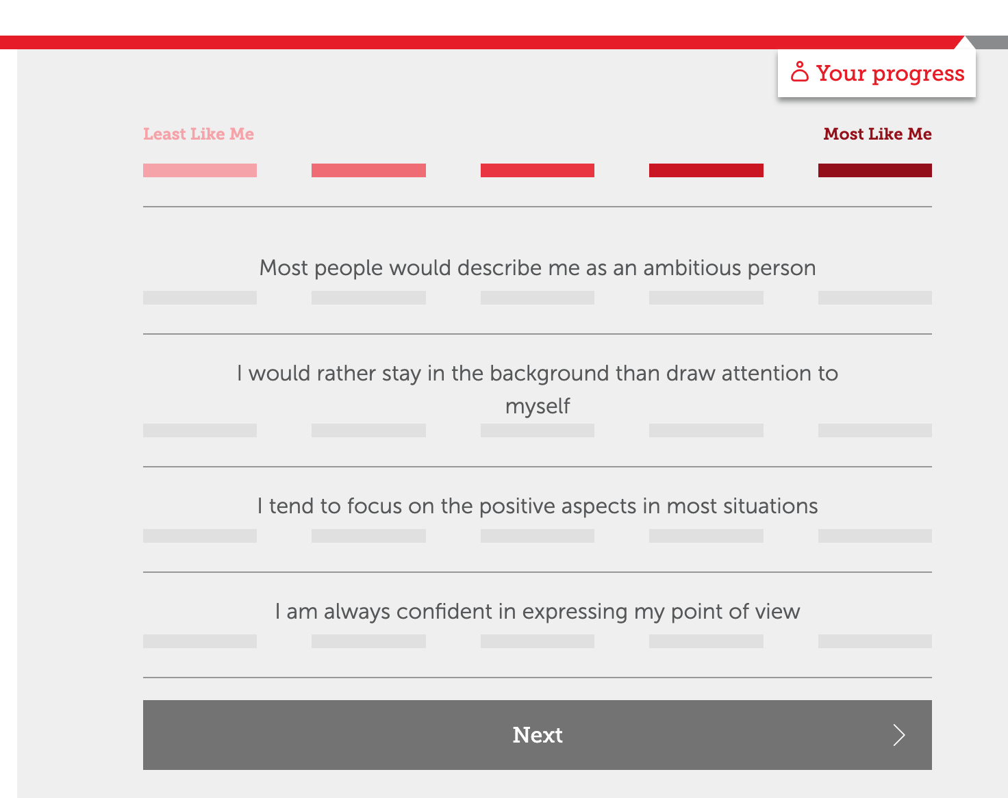 - 5-point scale from "Least Like Me" (pink/light) to "Most Like Me" (dark red)