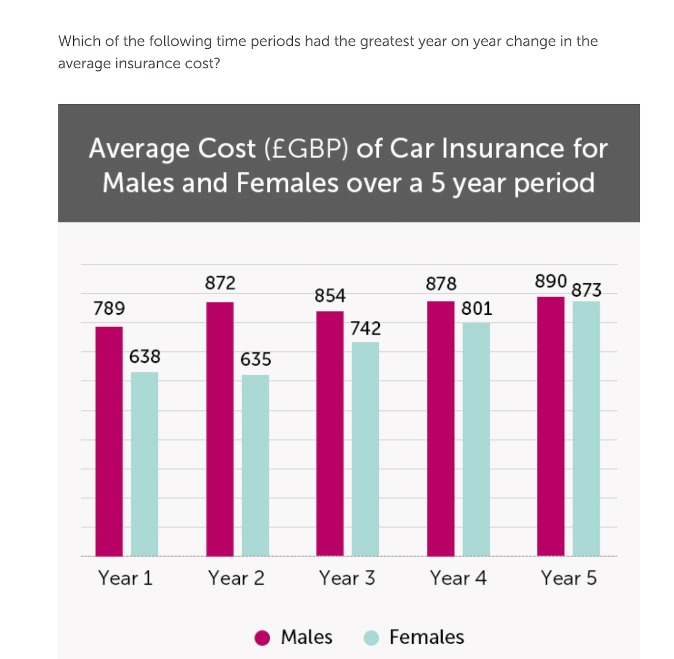 Therefore, the period between Years 2 to 3 had the greatest average year-on-year change of +44.5 GBP. This was largely driven by the significant increase in female insurance costs during this period (+107 GBP), despite male costs decreasing slightly (-18 GBP).