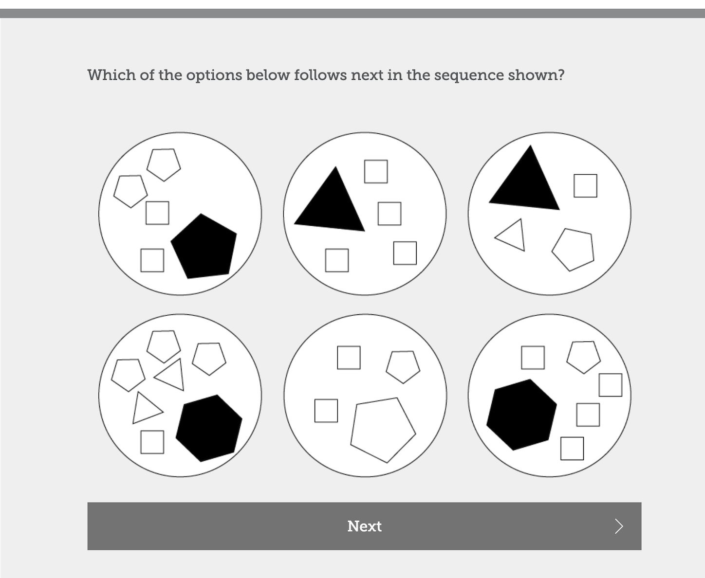- Based on the black shape pattern: The next would likely be a hexagon or different shape since triangle repeated