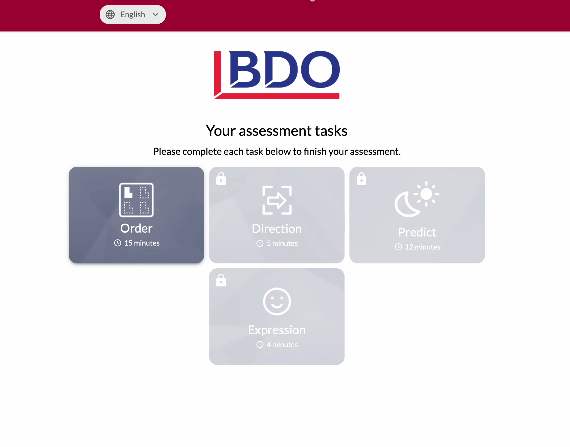 - The BDO Assessment length has 4 tasks and each task is 5 to 10 mins each