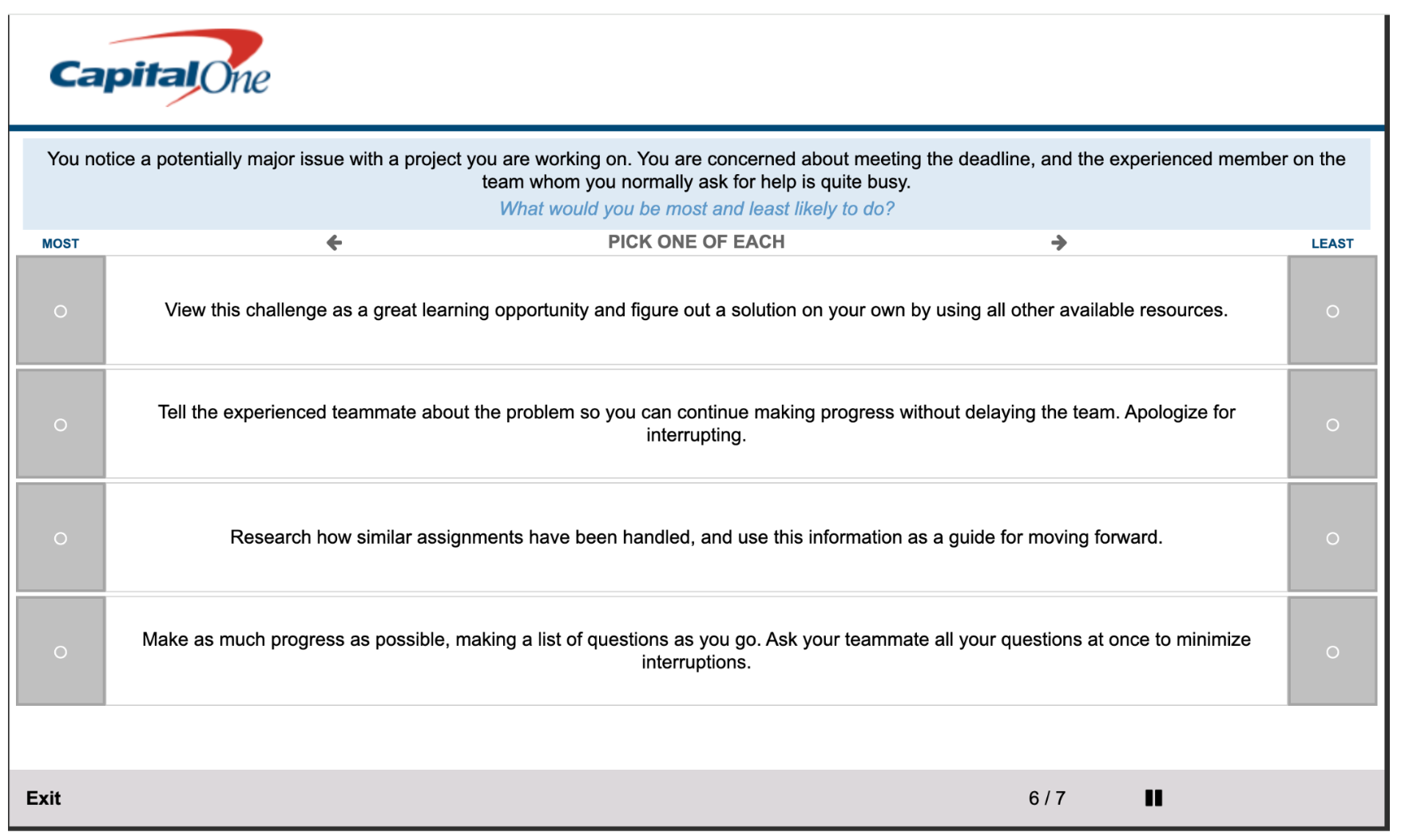 This type of question is from the personality/behavioural self-assessment part of the Capital One Virtual Job Tryout.