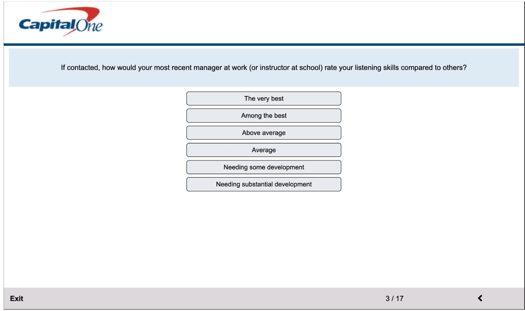 - Listening is a core competency for teamwork, problem-solving, and customer interaction. Capital One values collaboration, empathy, and communication — so rating yourself highly here is strategic.