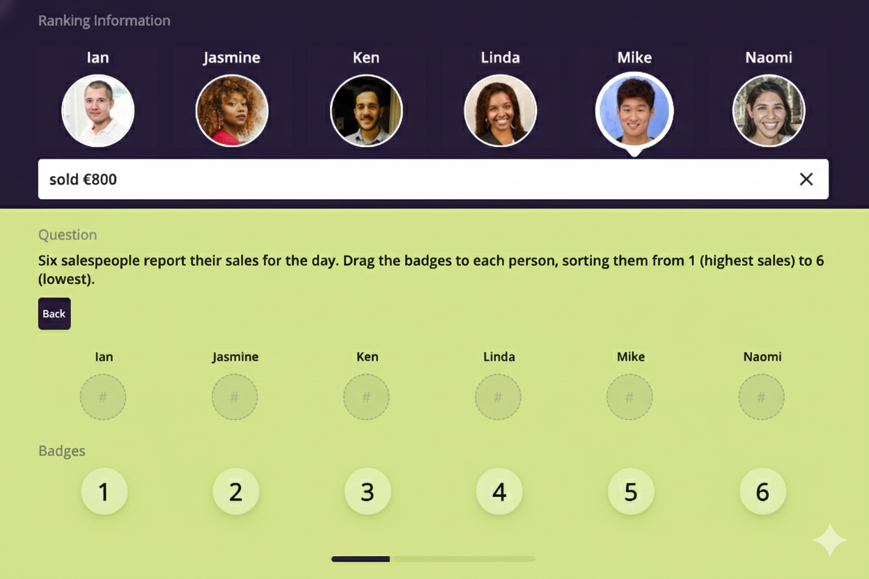 - By using the €800 value for Mike as a "control" or anchor point, you can visually gauge who is above him (Ken and Linda) and who is below him (Jasmine, Naomi, and Ian) to complete the sequence accurately.