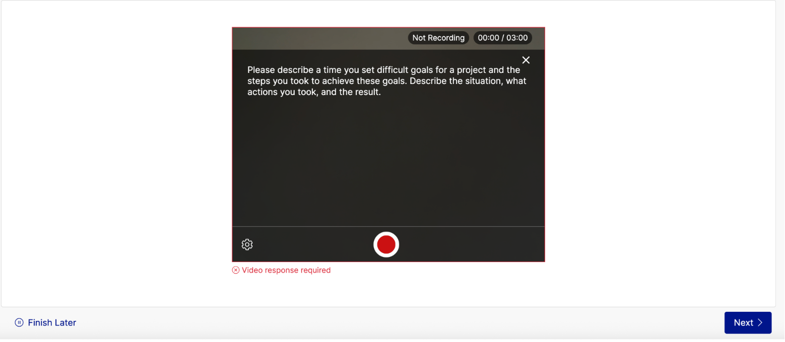 - Before you record any video responses, you'll complete two short cognitive games. These aren't traditional aptitude tests — they're gamified challenges that measure how you think, not just whether you get the right answer.