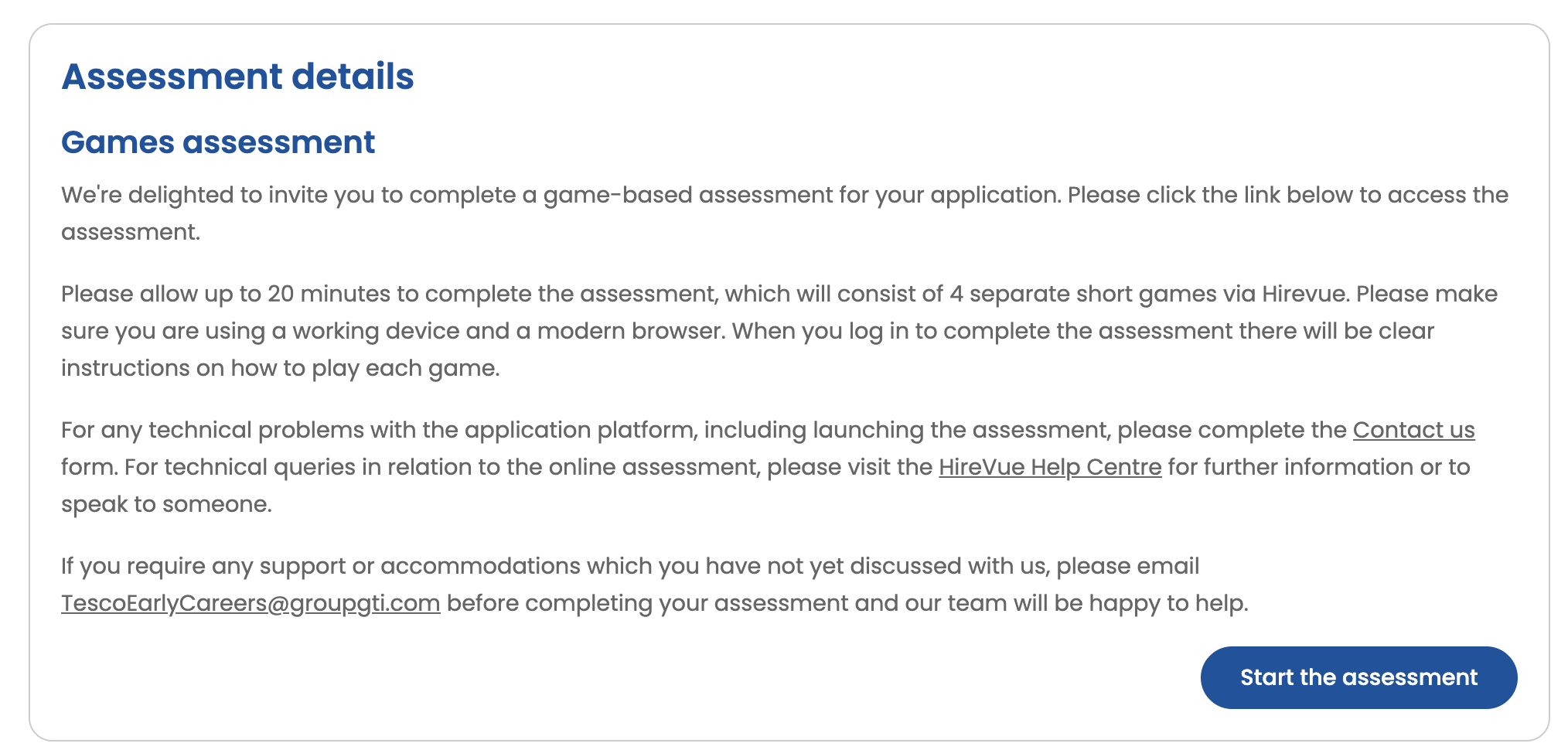 - The Tesco game assessment is conducted by hirevue and there are 4 game assessments to do