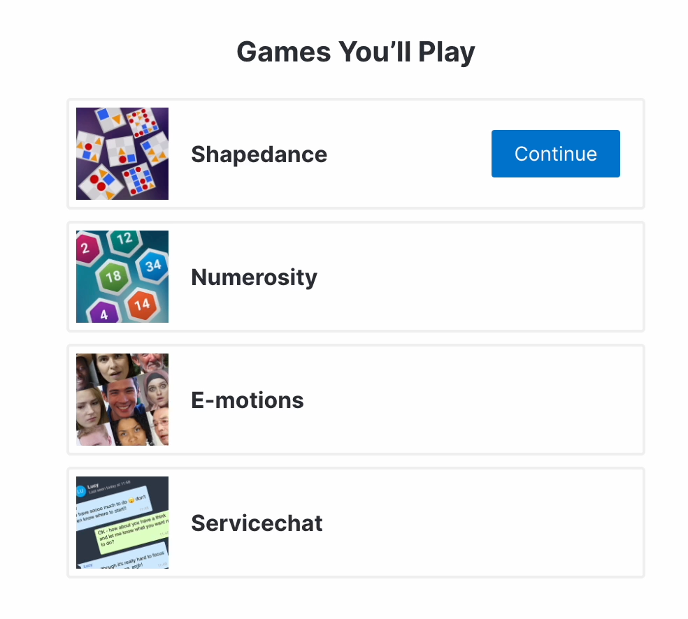 - The games you'll play are, shapedance, numerosity, e-motions and service chat